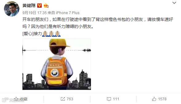 著名体育评论员,节目主持人黄健翔也发了这条微博:开车的朋友们,如果在行驶途中看到了背这样橙色书包的小朋友,请放慢车速好吗?因为他们是有听力障碍的小朋友。