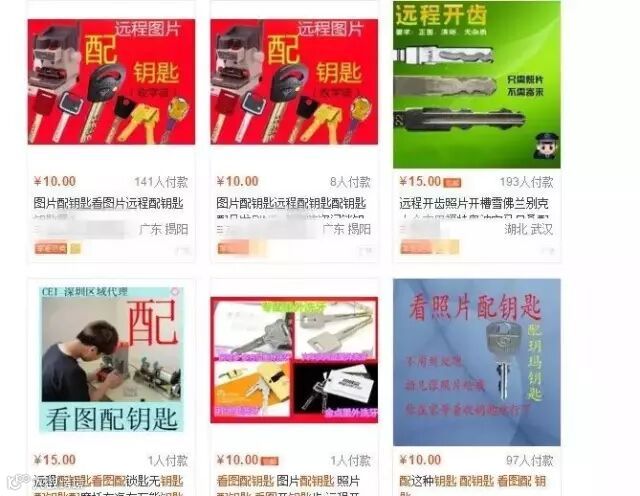 在一家名为某锁具的店铺里,就提供看图配钥匙的服务。在商品介绍一栏里清楚的写到,“只要你提供钥匙图片我们就可以给你配出钥匙”的字样。店铺详情显示,该店是主营锁具的五年皇冠老店,其中看图配钥匙这项服务已经成功交易1645次,累计评价500多条,其中好评颇多。