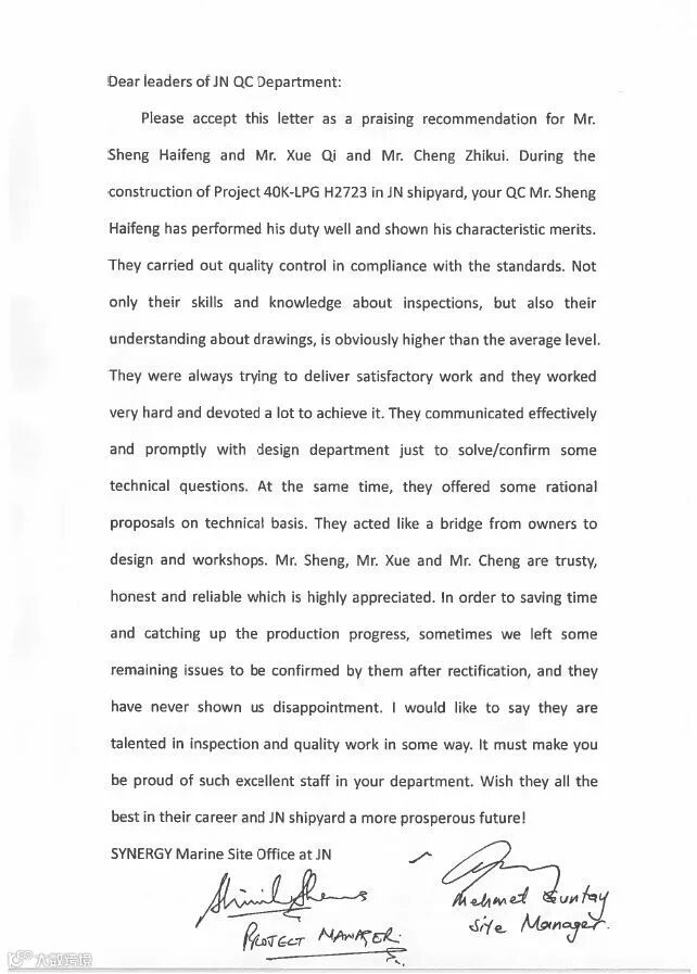 近日,品质保证部收到SYNERGY Marine船东发来的表扬信,对盛海峰、薛琪、程志奎三位检验员高效、高质量的质量管理工作表示肯定,对公司生产部门的建造质量表示认可,并对品质保证部的辛勤付出表示感谢。
