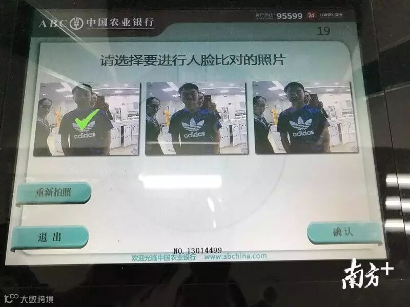 在授权完成后,正视“超级现金柜台”上的摄像头,就能进行“刷脸”。刷脸之后,屏幕上会显示三张照片,选择较为清晰的照片,通过与公安机关备案系统中的照片比对,“超级现金柜台”就能“识别”你啦。