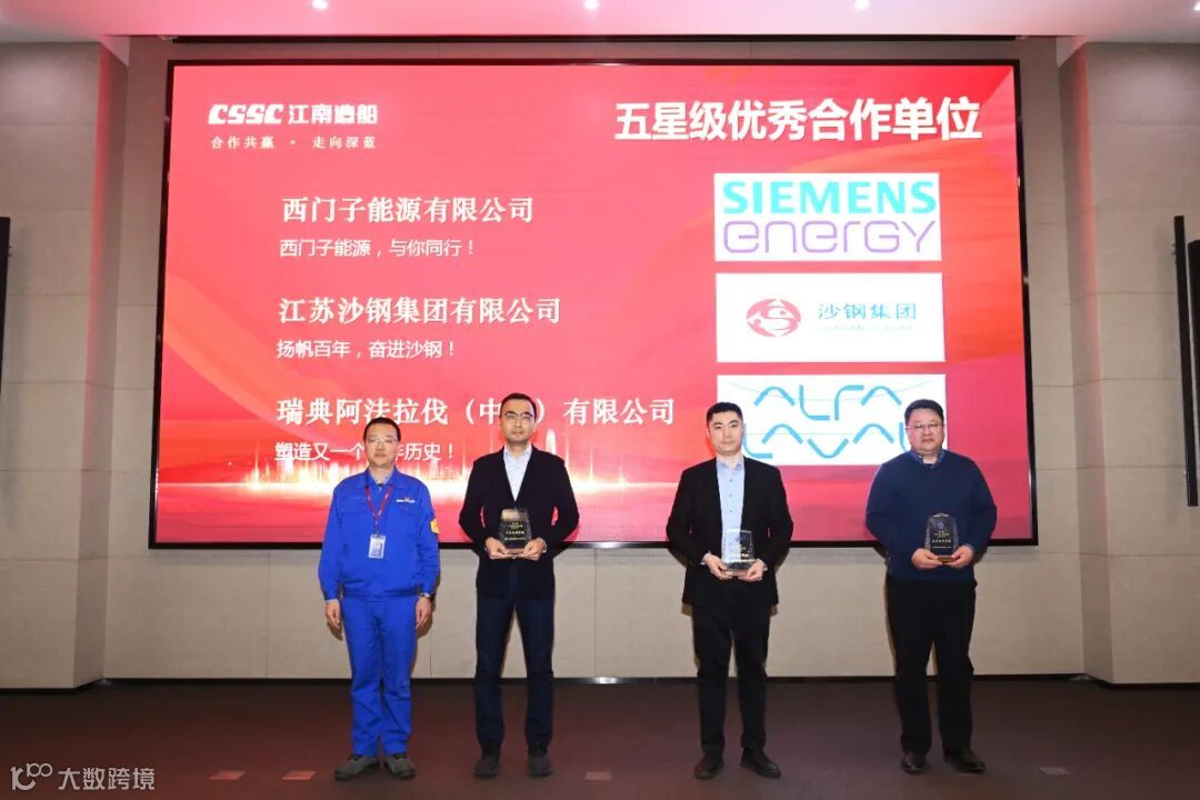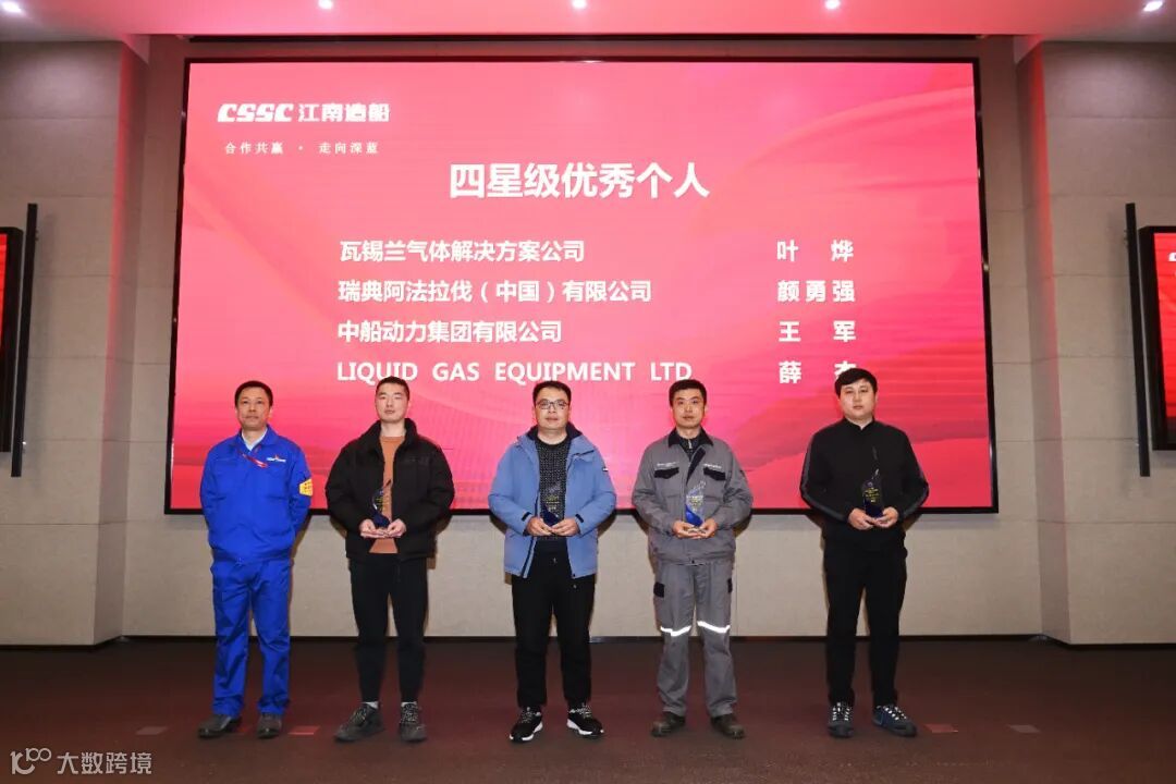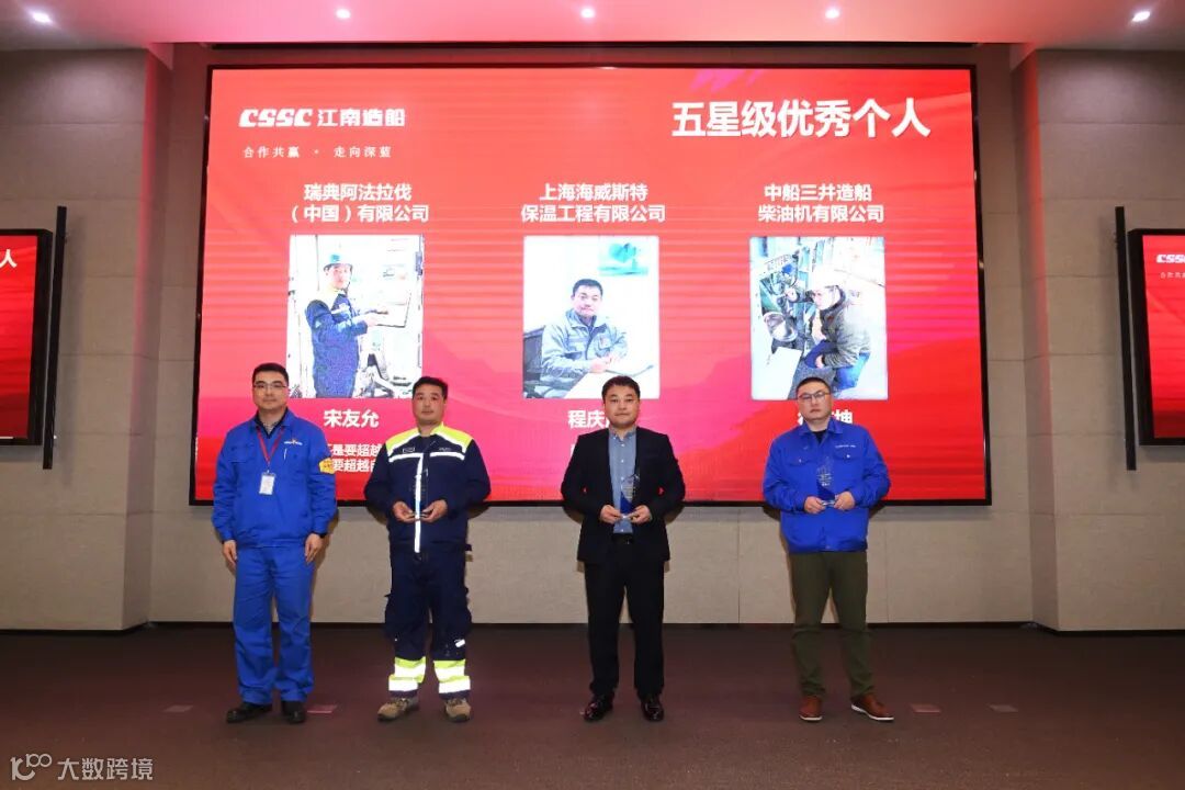 会议表彰了3名五星、4名四星和5名三星优秀个人;以及3名五星、5名四星和7名三星优秀合作单位。中国船舶动力集团有限公司的徐乾坤代表优秀个人做了发言;西门子能源有限公司张利成总经理、江苏沙钢集团有限公司王科副总经理、瑞典阿法拉伐(中国)有限公司事业部总裁乐嘉毅代表优秀合作单位发表了感想。他们表示接下来将继续努力工作,保持好五星水准,以优质的产品、优质的服务保障江南建造任务顺利完成。