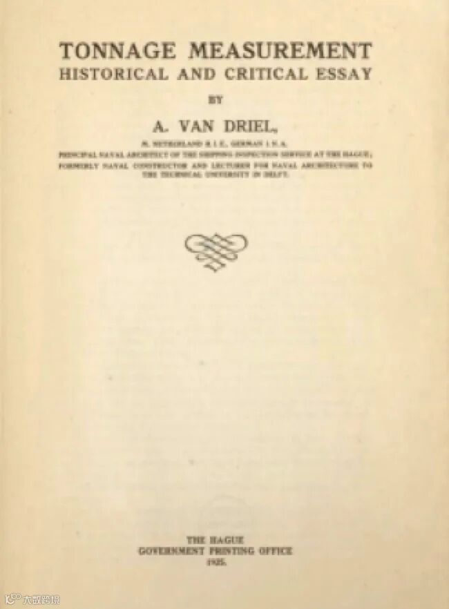 为什么吨位不是重量?吨位的定义和吨位丈量制度是怎么发展而来的?从史料研究的角度来看,要数荷兰海牙船舶检验局的资深船舶验船师A.Van Driel的专著“Tonnage Measurement, Historical and Critical Essay”(图1)最为专业和详尽,这本书1925年由The Hague Government Printing Office出版,全书164页,研读起来相当费劲。日本船舶验船师山下正雄翻译了A.Van Driel的这本专著并取名为《船舶の積量測度》。在《船の科学》1983年7月刊上,伊丹良雄发表了一篇题为“トンの発生と積量測度”的文章,对A.Van Driel的这本专著和其它的相关吨位丈量的史料进行了较为全面地归纳和梳理。此外笔者还注意到,《中国古近代船检暨相关航政史料汇要》一书,对中国古代的吨位丈量制度也有一些相关的描述。