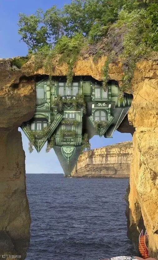 连接两座山峰的岩石本就脆弱,还倒挂一座房子,头顶海水,脚蹬虚空,心都要跳出来 ▼