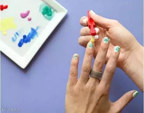 准备好你想染上的不同色彩的指甲油,倒一些到硬纸板上,然后用牙刷沾上,小心翼翼地蘸到指甲上,连续几次,艺术指甲便如此完成。