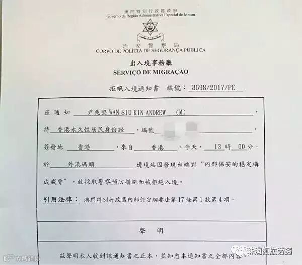 據香港電台報道,香港民主黨立法會議員今天下午前往澳門,遭到當局以「對澳門內部保安的穩定構成威脅」為由,被拒絕入境,隨後他被原船遣返香港。