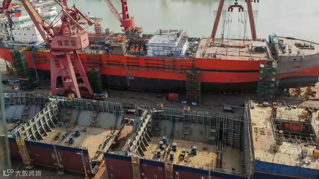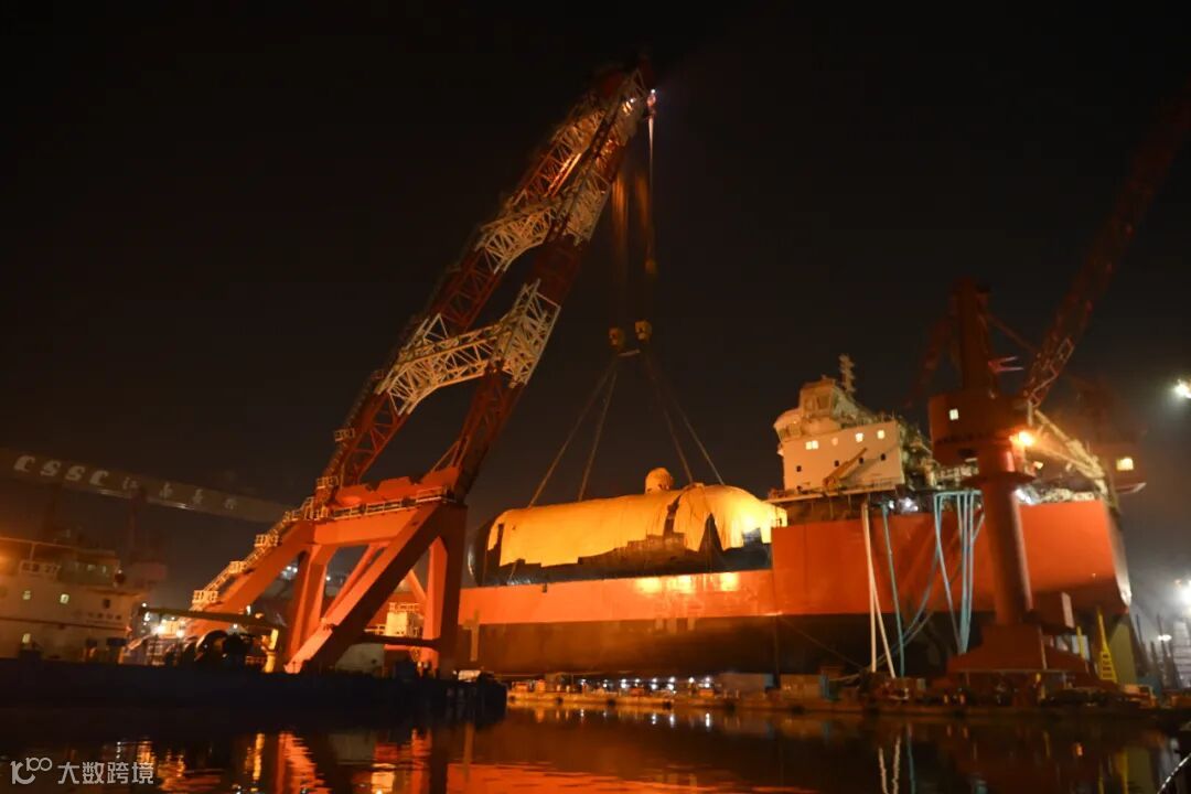 1月17日吊装全宽甲板60Z(由巨型总段+压缩机房+液货系统单元等组成的甲板模块)