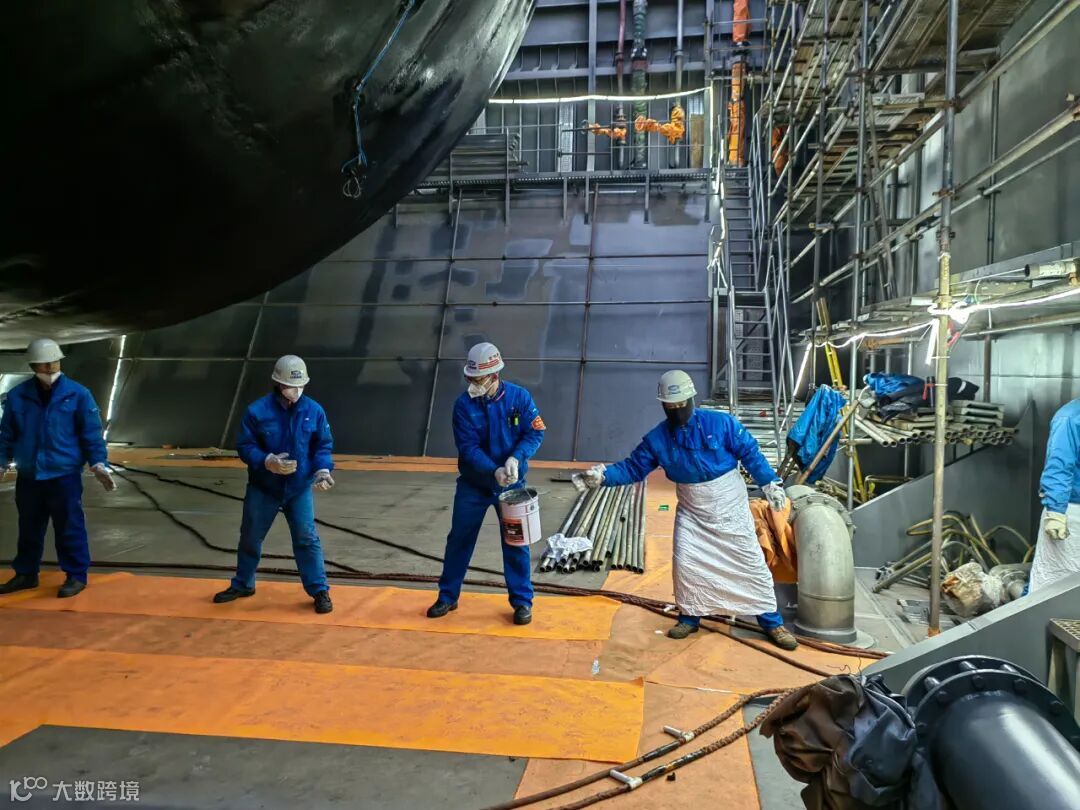 高精度、高效率,源于设计与生产的紧密结合,也得益于精度管理部设置船、罐、盖、管一体化精度链:分析关键控制项,梳理吊装定位风险,针对环氧浇筑、吊装干涉、气室围壁工序前移、液货合拢成品管制作等制定专项精度管控方案。