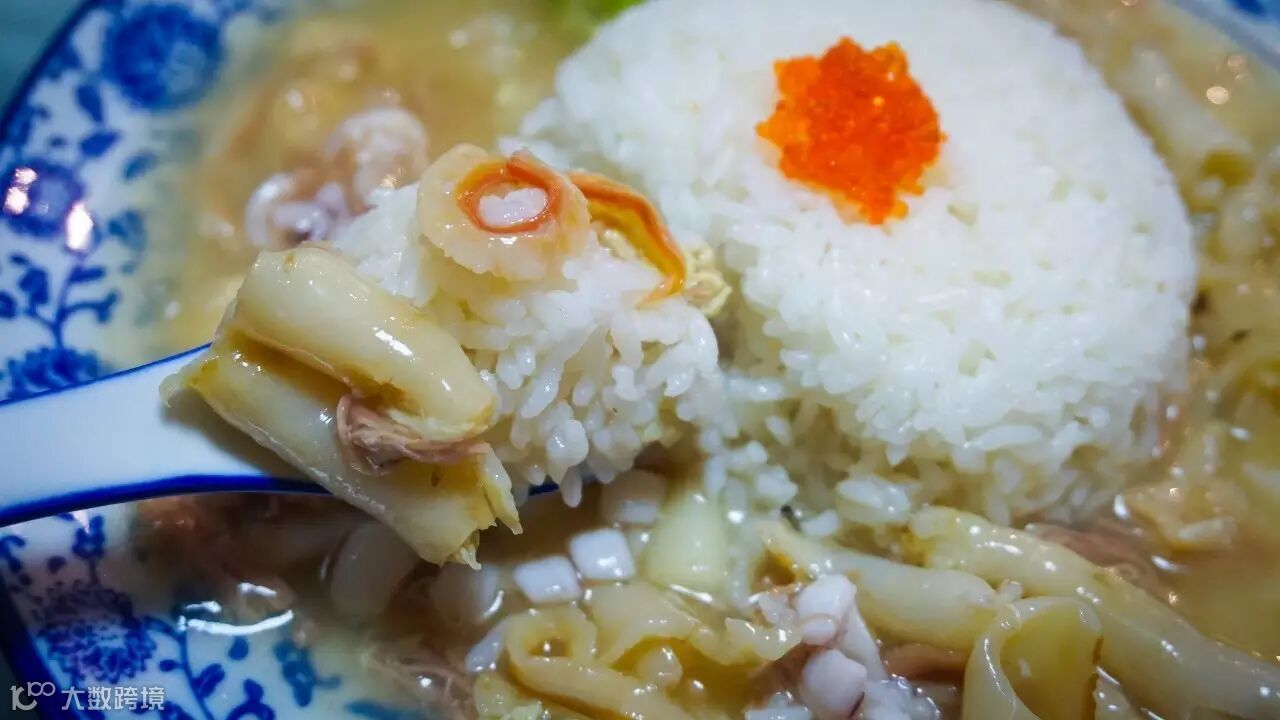 经浓厚的汤底煨烂的鱼翅入口即溶,口感软滑,有蟹子、墨鱼翼为佐。一口鱼翅饭,细细咀嚼,这五常大米的清甜与海味的鲜美绝配,味留舌底,心满意足。
