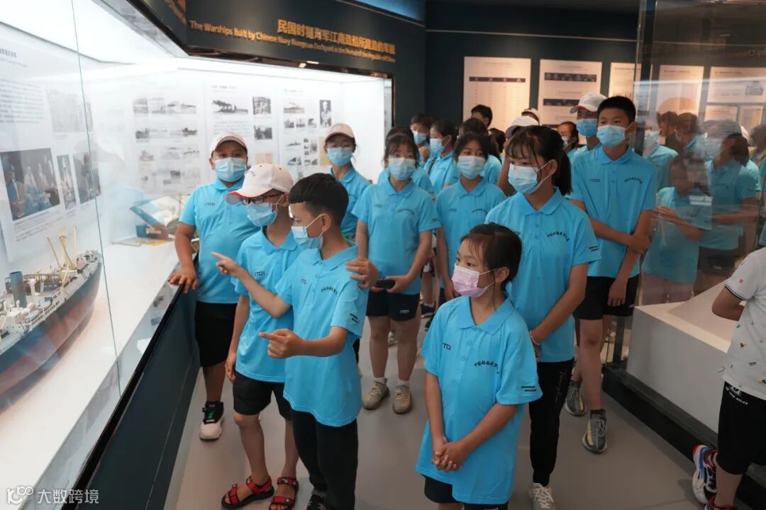 在江南造船展示馆,师生们在照片墙下合影,并如同上课一样认真观看了江南宣传片和“雪龙2”号介绍片。