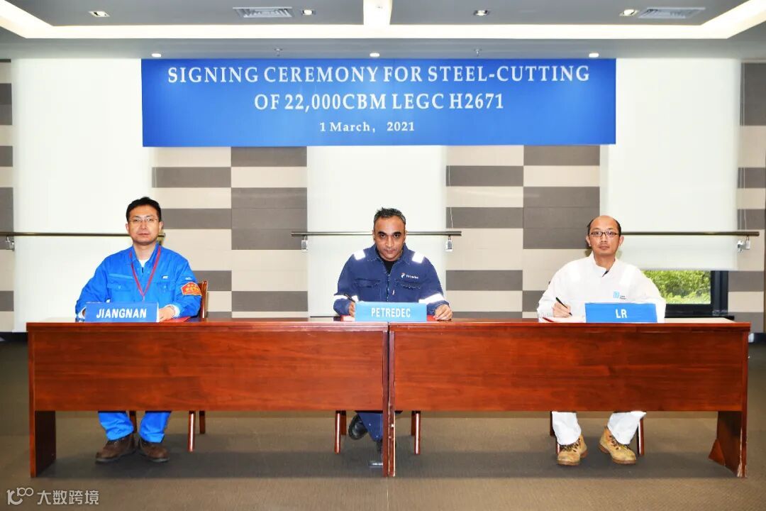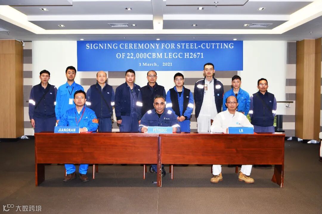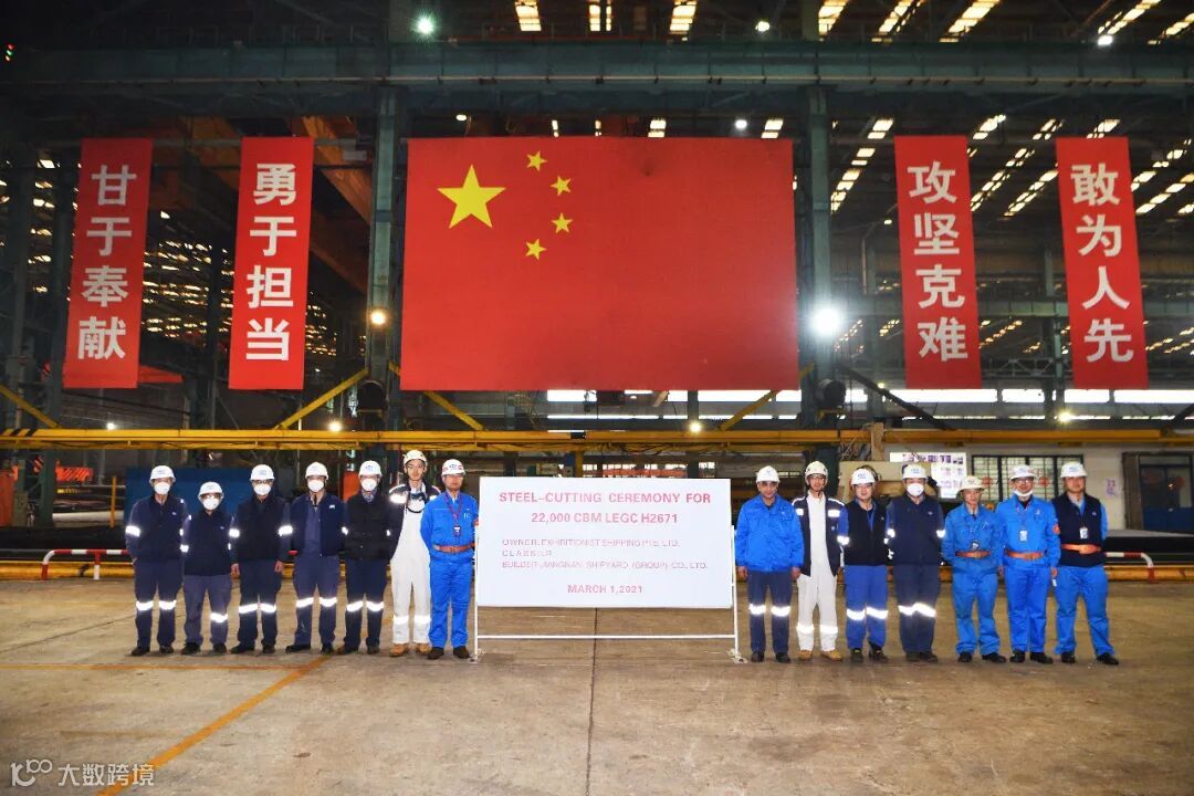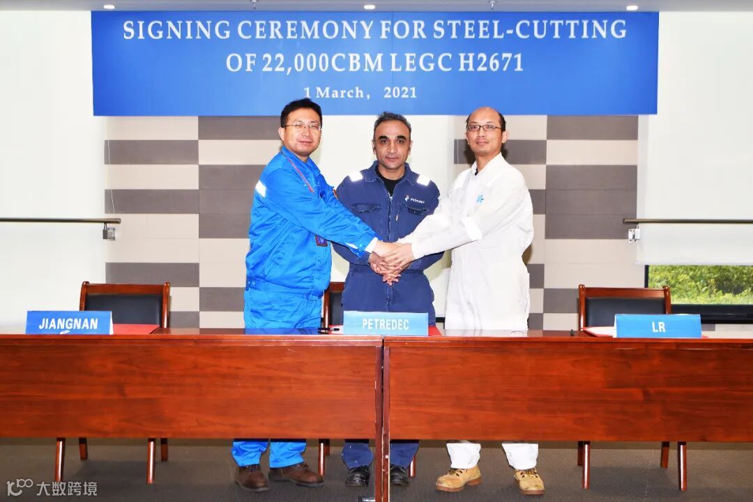 3月1日上午10:00,中国船舶集团旗下江南造船为Petredec公司建造的22000立方米乙烯运输船系列船第三艘在江南造船制造一部切割跨间开工。船东监造组代表Kumar、英国劳氏船级社代表胡江山、该项目总建造师曹新光在开工节点证书上签字。