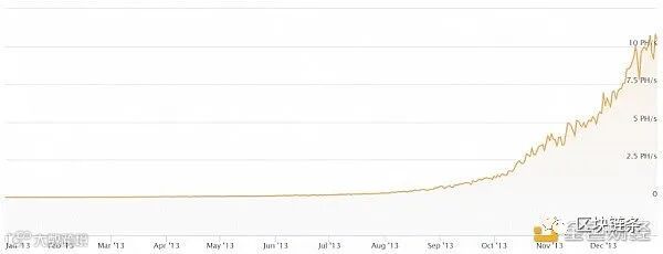 由于使用专业计算机芯片和高处理能力矿机的专业挖矿公司出现,比特币网络挖矿难度变得越来越高,也使得这些公司在挖矿生态系统中创造出了一个利基市场。下图展示了2013年比特币网络算力走势(资料来源coinwarz),从中我们看到比特币自从2013年进入ASIC时代之后,网络算力便大幅提升,以至于当时只用了几个月时间就把GPU挖矿淘汰了。配备GPU芯片和上一代ASIC芯片的小型矿工根本无法与使用高端ASIC矿机的矿工竞争,最终也迫使他们不得不选择“关机”。
