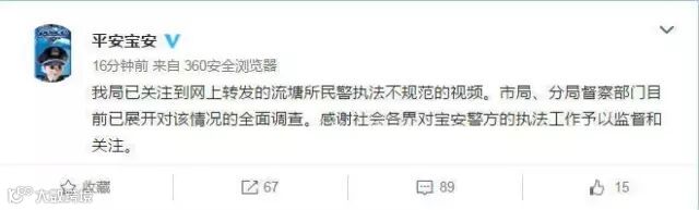 6月10日下午3点,@平安宝安 发出微博:我局已关注到网上转发的流塘所民警执法不规范的视频。市局、分局督察部门目前已展开对该情况的全面调查。感谢社会各界对宝安警方的执法工作予以监督和关注。