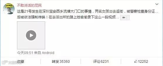 10日,据微博网友@不敢说话的屁民 爆料,5月21日在深圳宝安西乡流塘大门口,两名女孩出去逛街,被警察检查身份证…后被依法强制传唤!在去派出所的路上她偷偷录下一段视频……