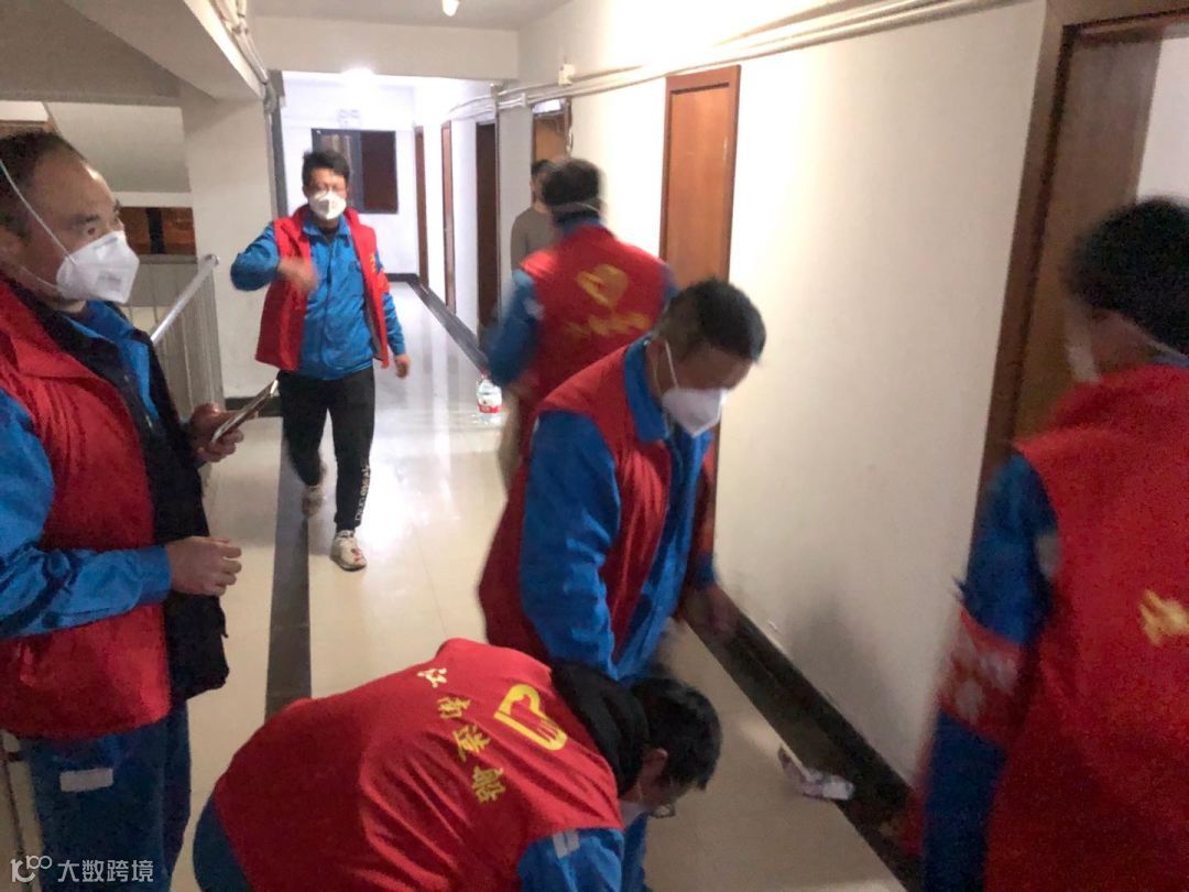 志愿者第一时间给进入生活区居家观察点的返厂员工送去水和食品