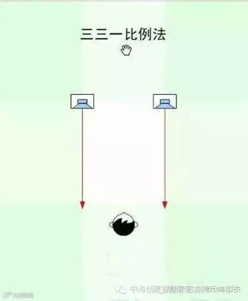 "三三一比例法"与"三一七比例法"所达到的效果差不多,都可得到平衡的声音与宽深的音场,不同的是二音箱之间的间隔较窄。以上两种音箱摆都适合用于面积较大而比例比均匀(如1:1.25:1.6或1:1.6:2.5)的视听空间。