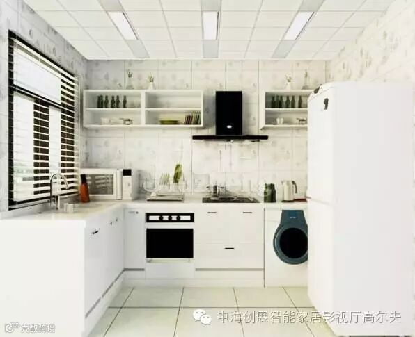 天地墙材质:开放式厨房因其开放的空间,油烟是无处不在的,在厨房区域的吊顶上,建议采用集成吊顶,集成吊顶色彩多种多样,不仅安装方便,也方便日后更换老化的烟管。