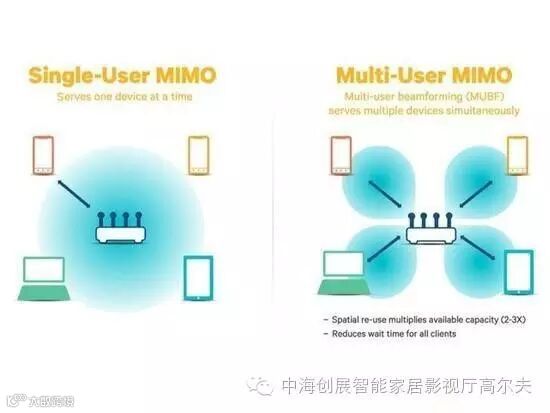 最后便是MU-MIMO(多用户多输入多输出)架构的使用。与传统802.11n时代的MIMO不同,MU-MIMO可以让无线路由器同时和多个无线终端进行通讯,大幅提升网络容量能效。