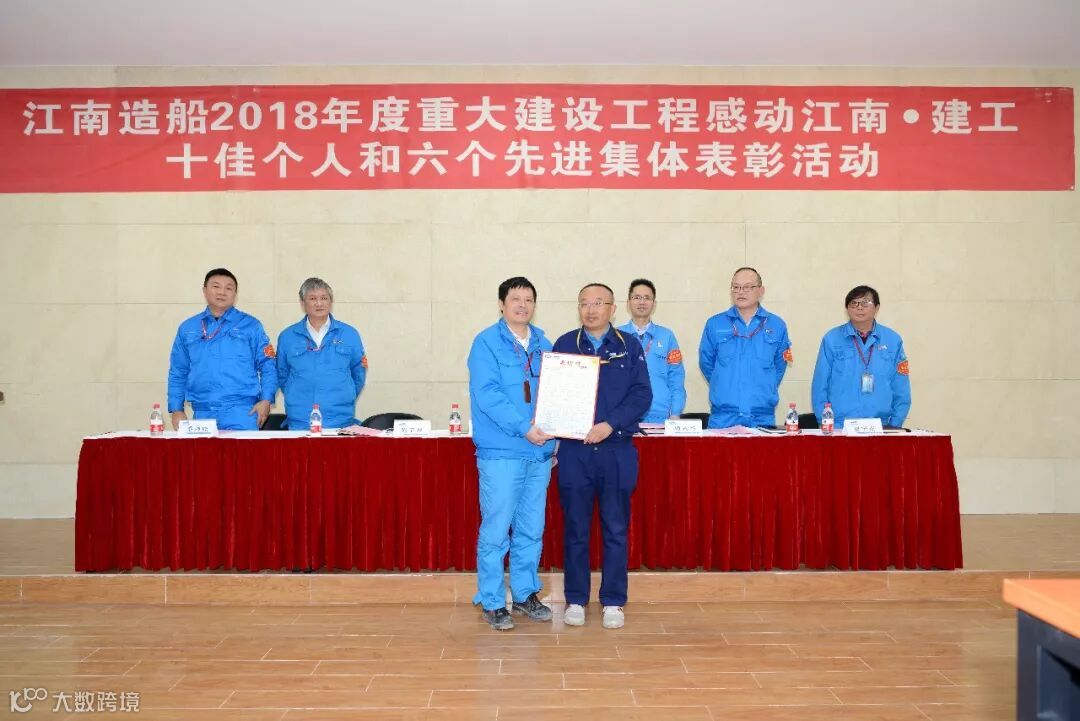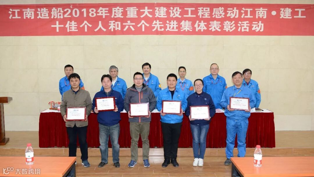 会议宣读了《关于表彰江南造船2018年度重大建设工程“感动江南•建工”十佳人物和六个先进集体的决定》,陈翠良等10人被评为“江南造船2018年度重大建设工程‘感动江南•建工’十佳个人”,上海文宇建设集团有限公司(舾装生产辅助用房建设项目项目部)等6家单位(项目部)被评为“江南造船2018年度重大建设工程‘感动江南•建工’质量管理先进集体、进度管理先进集体、安全保密文明生产先进集体”。邹元晶向中船第九设计研究院工程有限公司(中船九院江南长兴项目部)颁发感谢信。
