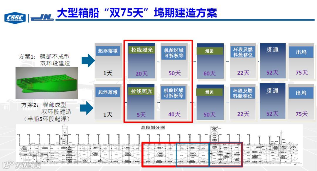 搭载二部重点围绕两年逐步完成“双60天”坞期建造提出了措施,包括利用浮船坞等资源进行大型环段异地建造方案,以解决场地和吊装的不利因素,缩短船坞周期和提高出坞完整性;根据全年物量负荷测算,针对物量高峰低谷思考平衡措施,通过承接兄弟部门施工项目,平稳过渡物量低谷,提升部门加工费收益。