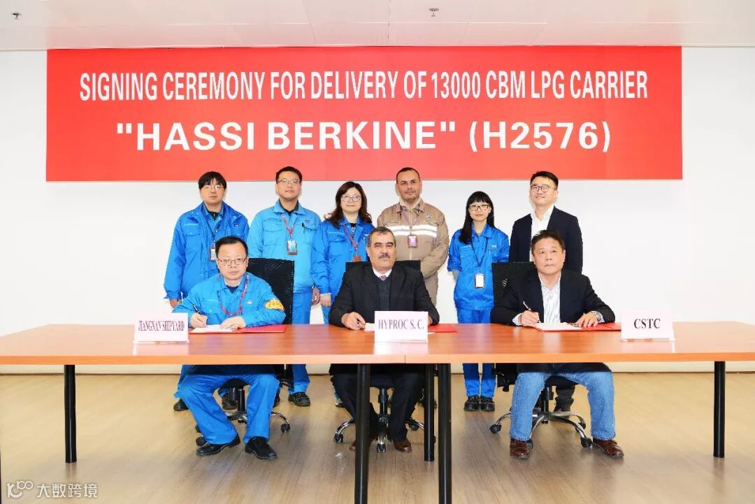 2018年12月20日,中船集团旗下的江南造船为Hyproc Shipping Company建造的13000立方米LPG运输船首制船(H2576)签字交船。Hyproc公司代表Mr. Benbelcacem,中国船舶工业贸易公司业务六部高级专务王燕中,江南造船总工程师胡可一参加签字仪式。