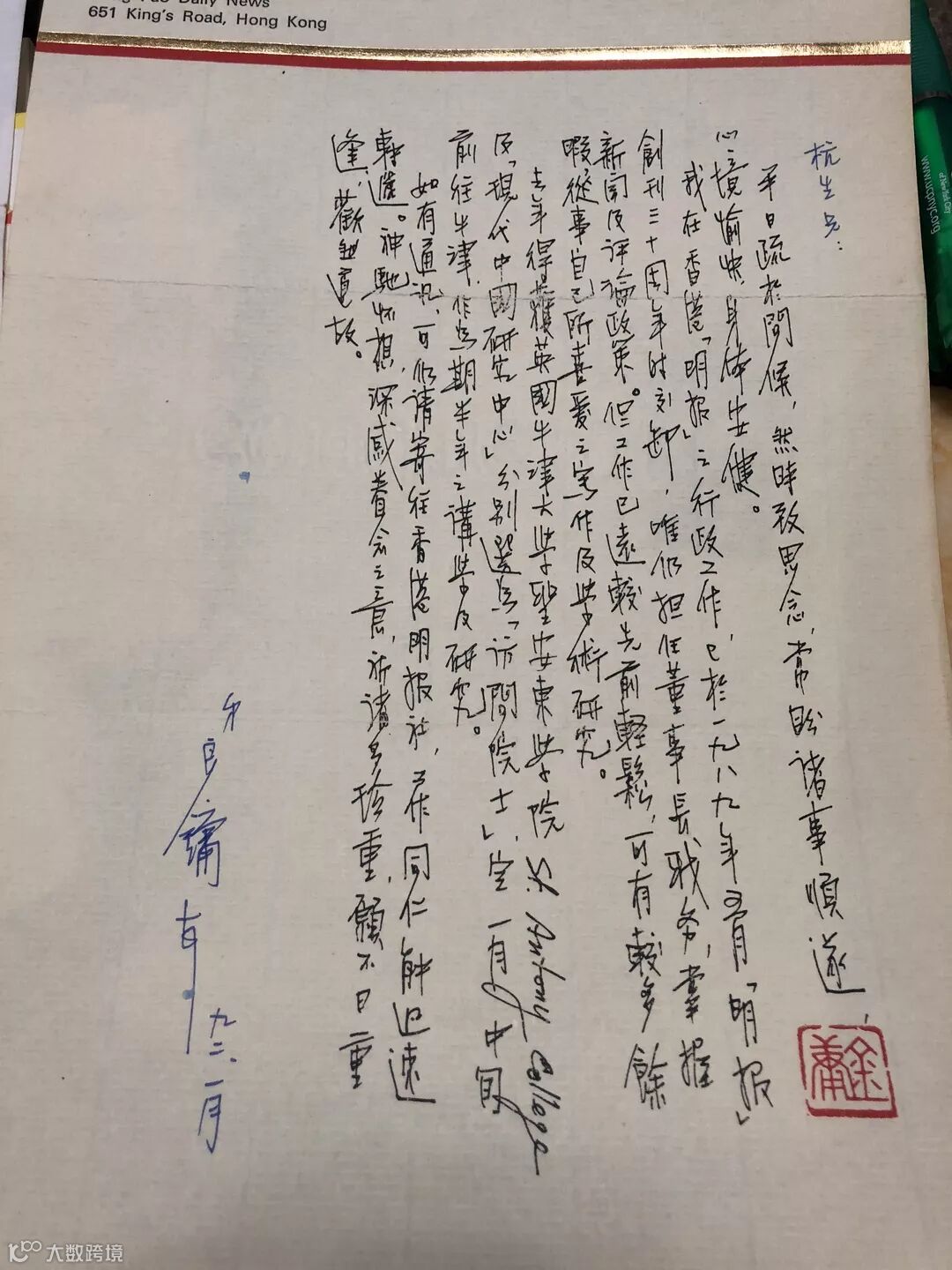 如有通讯,可仍寄经香港明报社,工作同仁能迅速转递。神驰怀想,深感眷念之意,祈请多珍重,愿不日重逢,欢然道故。