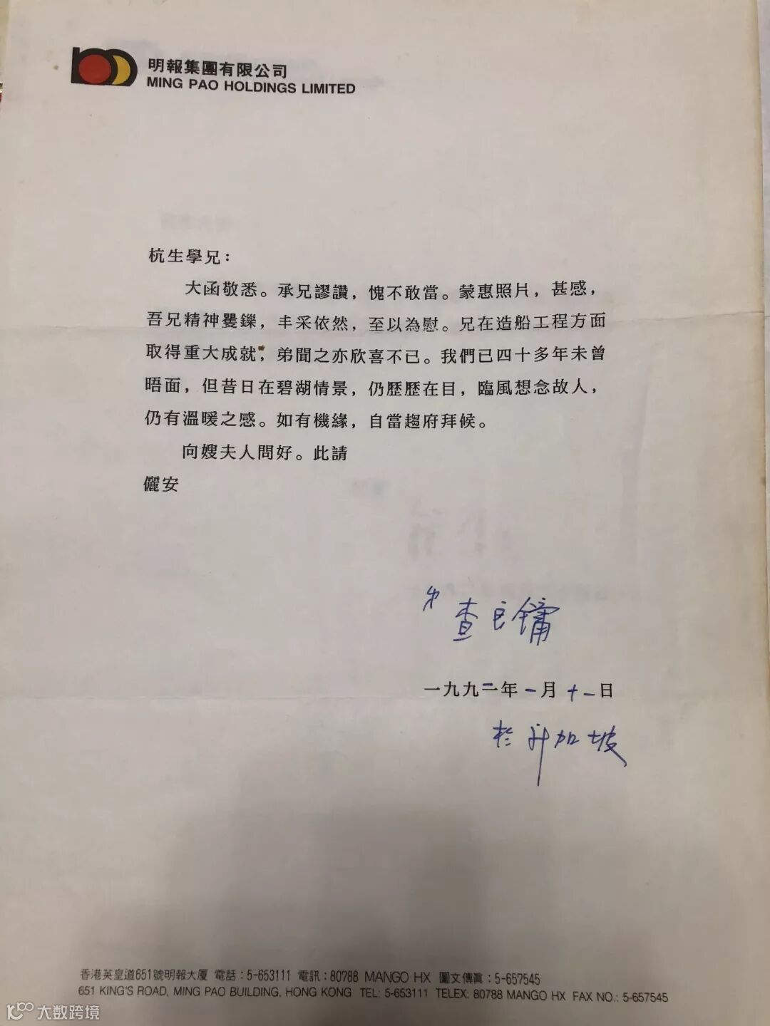 吾兄精神矍铄,风采依然,至以为慰。兄在造船工程方面取得重大成就,弟闻之亦欣喜不已。我们已四十多年未曾晤面,但昔日在碧湖情景,仍历历在目,临风想念故人,仍有温暖之感。如有机缘,自当趋府拜候。