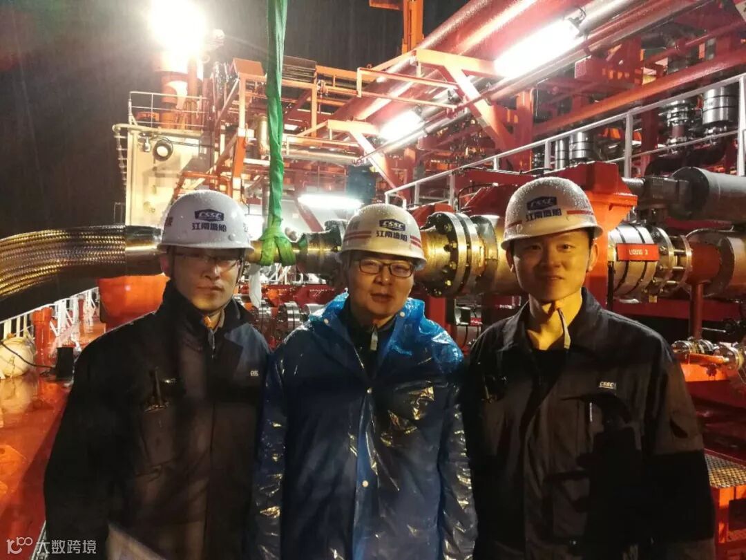 气体试验中,生产管理部主要负责岸上槽车操作的密性试验、船上指令传达、船岸协调、安全管控、船舶系缆状态检查、后勤保障等。巩鹏、杨恒兵、胡瑞、沈波四人值守,一方面要督促协调槽车的连续性供应,另一方面要确保操作过程中的安全可控。为了确保岸上所有操作始终在监控范围内,四人夜以继日地工作,平均每天睡眠仅2小时。岸上为危险区域,为了防止静电的产生,即便下雨天也不能穿雨衣,在-4℃几乎滴水成冰的雨夜,四人的防静电服都湿透了,却仍然坚守岗位。“最开心的时间,就是到食堂吃饭,有空调和热饭菜,能够享受短暂的温暖”,巩鹏介绍道,“整个过程,公司领导也和大家战斗在一起,指导气体试验团队有条不紊地开展各项工作。”
