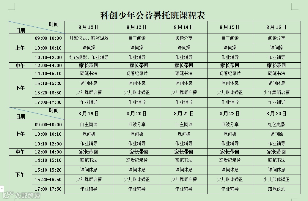 托班时间:8月12日-8月23日(不含周末)每周一至周五上午9:00—12:00;下午14:00—17:30