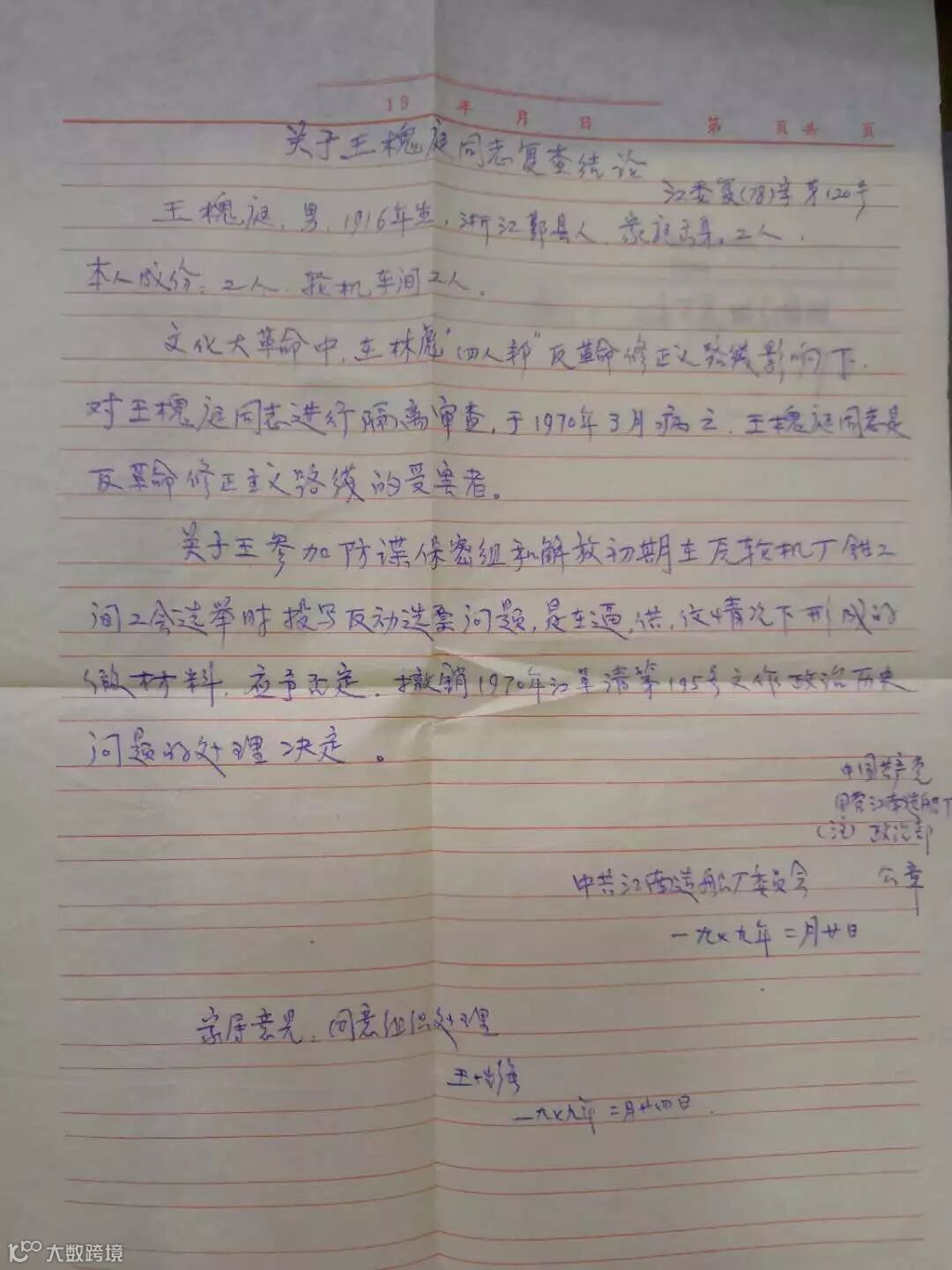 1979年,江南造船党委展开对王槐庭“谍报人员”的重新调查,认定属于冤案,予以平反,此时距离王槐庭逝世,已有九年。