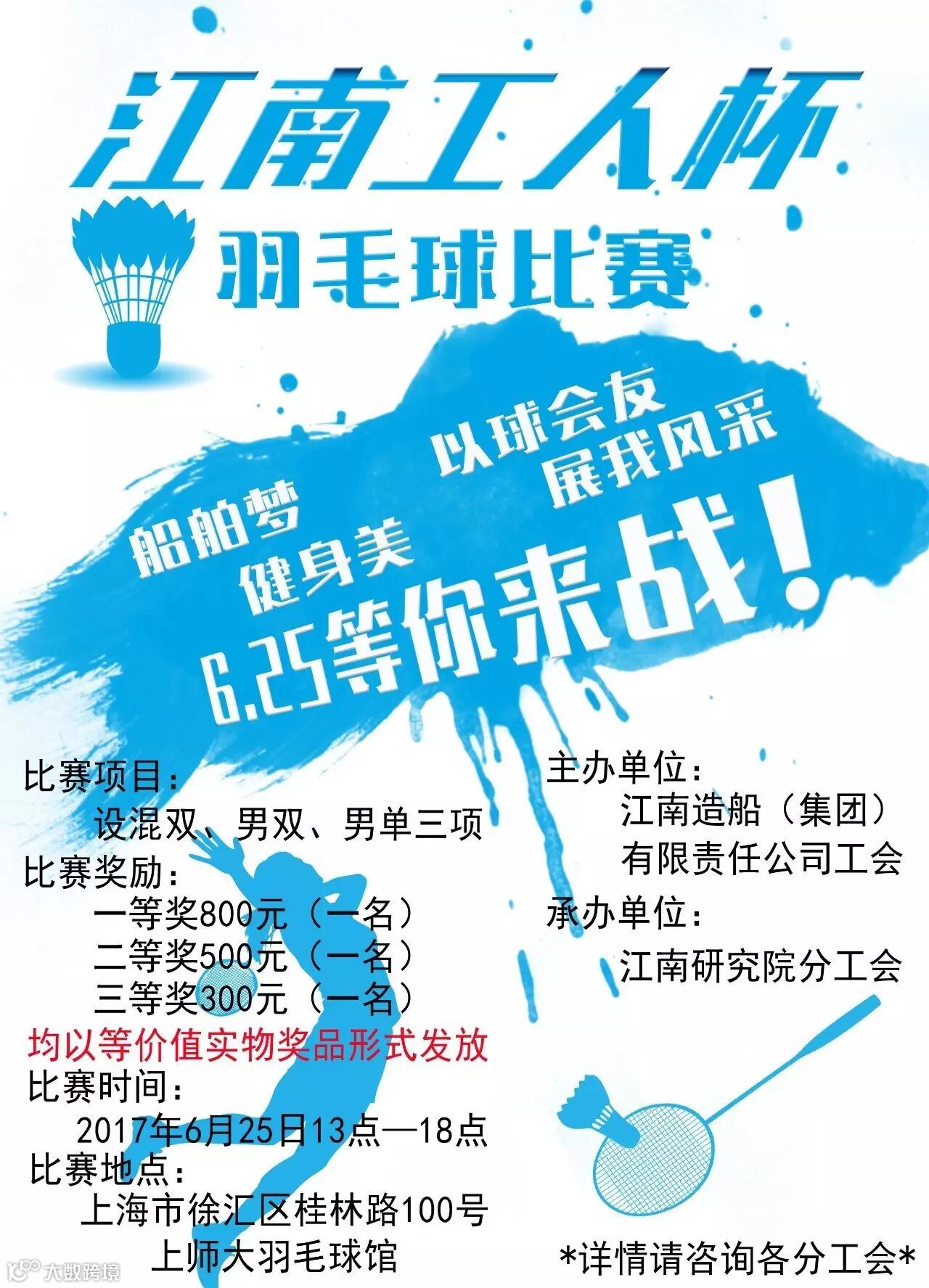 6月25日,“江南工人杯”暨上海船舶工会第四届“远望杯”羽毛球选拔赛在上师大羽毛球馆成功举行。下面请跟着小编一起回顾当时的精彩画面吧!