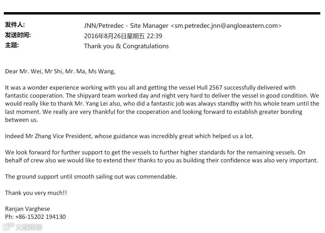 值得一提的是,交船后,船东向江南造船发来了感谢信,肯定了该船的交船状态,同时也对江南造船的的努力工作表示了感谢,并期望双方在未来建立更加良好的合作关系。