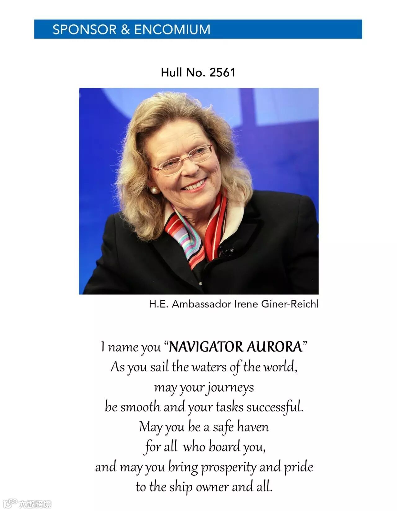 奥地利驻华大使艾琳娜(H.E. Irene Giner-Reichl)阁下担任教母,将该船命名为“NAVIGATOR AURORA”。Borealis公司执行副总裁、奥地利驻上海总领事馆总领事施丽伟、中国船舶工业集团公司副总经理南大庆、船东和船级社代表等贵宾出席命名仪式。
