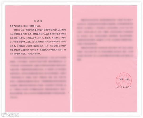 海军152舰写给李鹏杰的感谢信