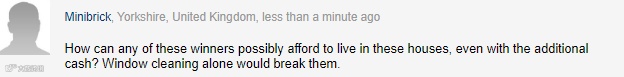 对此,一些网友认为:就算不是危房,普通人家根本负担不起奢华的生活方式:“这些赢家住不起这样的豪宅吧!光是搞卫生擦窗子就要老命了。”