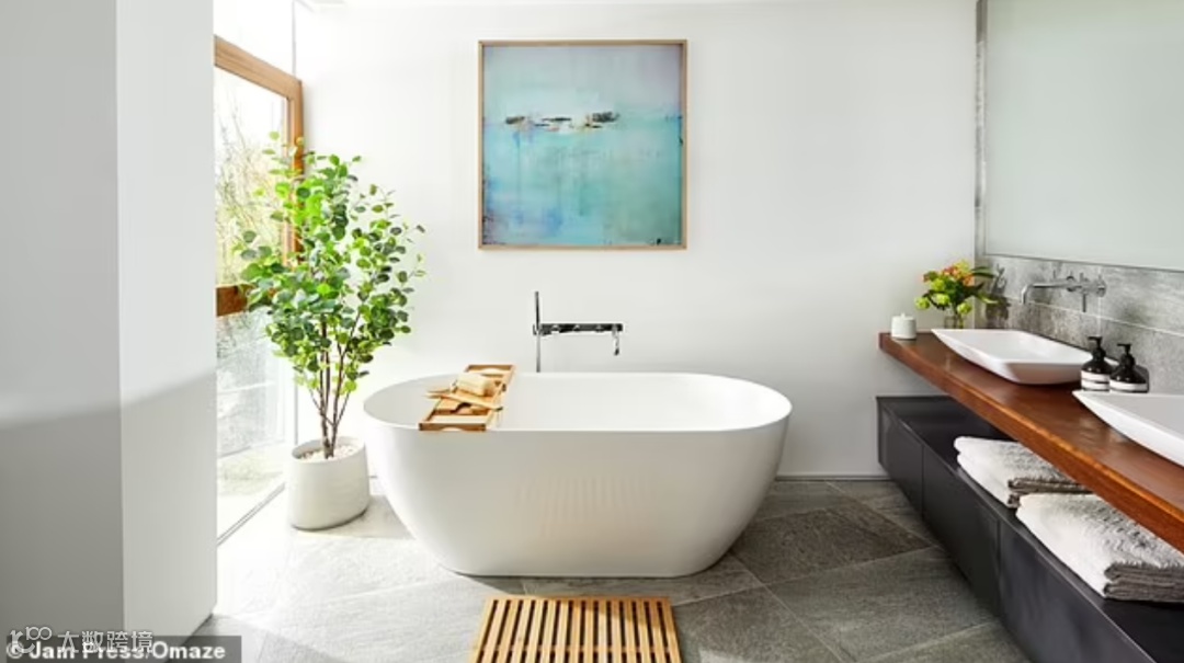 不管在室外哪个角落看都是治愈的风景线,而室内极简设计的宽敞浴室充满禅意!