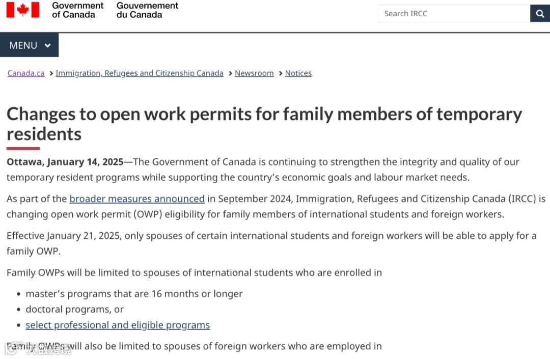 作为2024年9月宣布的改革的一部分,加拿大移民、难民和公民部(IRCC)将对一些国际留学生和外国工人的家庭成员实施新的开放式工作许可证(OWP)资格要求。新闻稿中称:“从2025年1月21日起,只有某些国际学生和外国工人的配偶才能申请家庭开放式工作许可证。”