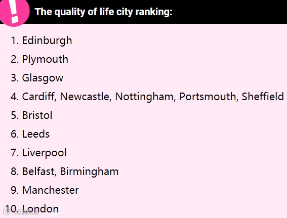 总体来说,除了伦敦以外,英国有挺多城市相对宜(pian)居(yi),上榜的城市中普利茅斯、爱丁堡、曼彻斯特、谢菲尔德、伯明翰等等,特点优势明显,居住幸福感指数高。不管是大城市还是小城市的生活都取决于个人的感受,喜欢又适宜居住是最好不过的~