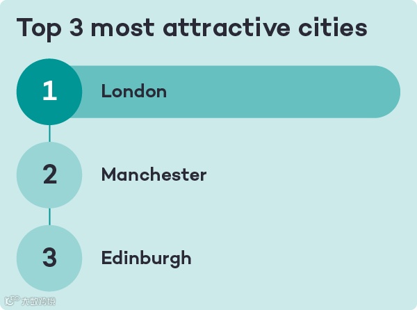 伦敦和曼彻斯特这两座城市却是英国人最向往的城市。伦敦的原因是这些城市有更高的收入潜力,在平均工资方面排名前三,并且提供丰富的工作机会。
