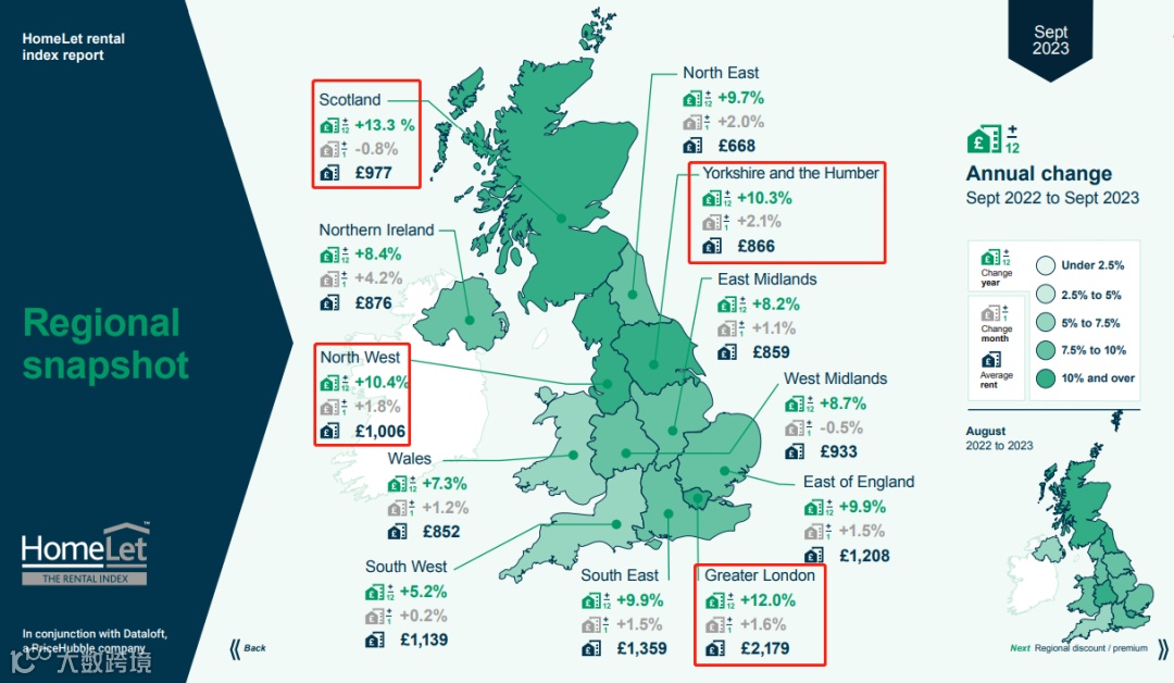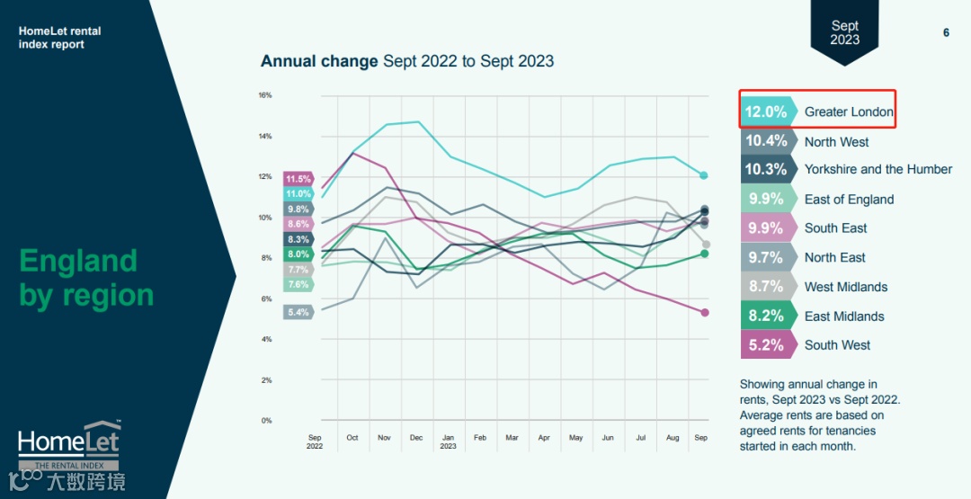 在租金上,伦敦的租金涨幅在英国内是数一数二的高。看到近一年来苏格兰以13.3%租金涨幅领先全英,大伦敦地区以12%涨幅位居第二。伦敦外的租赁市场的涨幅9.3%,低过全英平均涨幅(10.1%)0.8%。