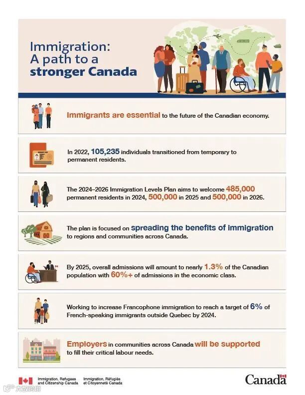 2022年,加拿大接收43.7万人打破了新移民的纪录。去年加拿大政府公布的计划是2023年向46.5万人发放永久居留权,2024年接收48.5万新移民。