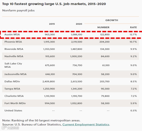 福布斯评论:奥斯汀为美国未来发展最佳城市!奥斯汀也是全美182个大都会区中排名第二提供最多工作机会的区域!