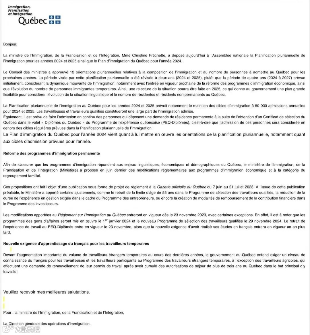 新政中大部分条款(留学生、PEQ)将于2023年11月23日生效。投资移民新政策将于2024年1月1日开始实施,新的技术移民政策将于2024年11月29日开始实施。