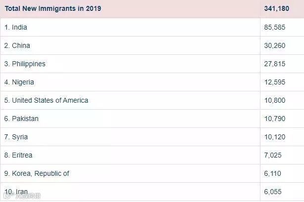 来自印度的移民成为主力,占了25%,2019年约有8.6万名来自印度的移民;中国的新移民排在第二位,占新移民之中的9%;其次是菲律宾,占新移民中的8%;前十名中其它国家分别为:尼日利亚丶美国丶巴基斯坦丶叙利亚丶韩国和伊朗。