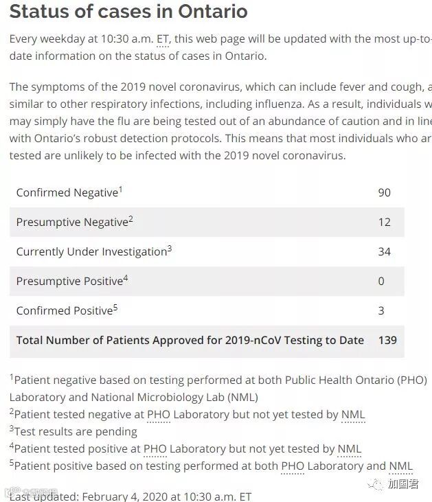根据安省2月4日早上10:50更新的最新数据,安省已经检查了139名从中国返回并且有症状的疑似人士,目前确诊数依然是3例,均已出院回家接受监控。