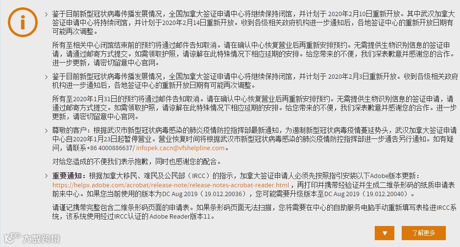 此前,加拿大关闭了所有在华的签证中心,不过,据官网最新消息称:全国加拿大签证中心将于2月10日重新开放,而武汉签证中心则会在2月14日重新开放。