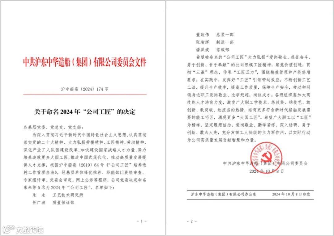 10月8日,公司2024年度公司工匠评选揭晓,朱未、任广渊、董政伟、张瑜辉、潘洪波5位员工榜上有名。