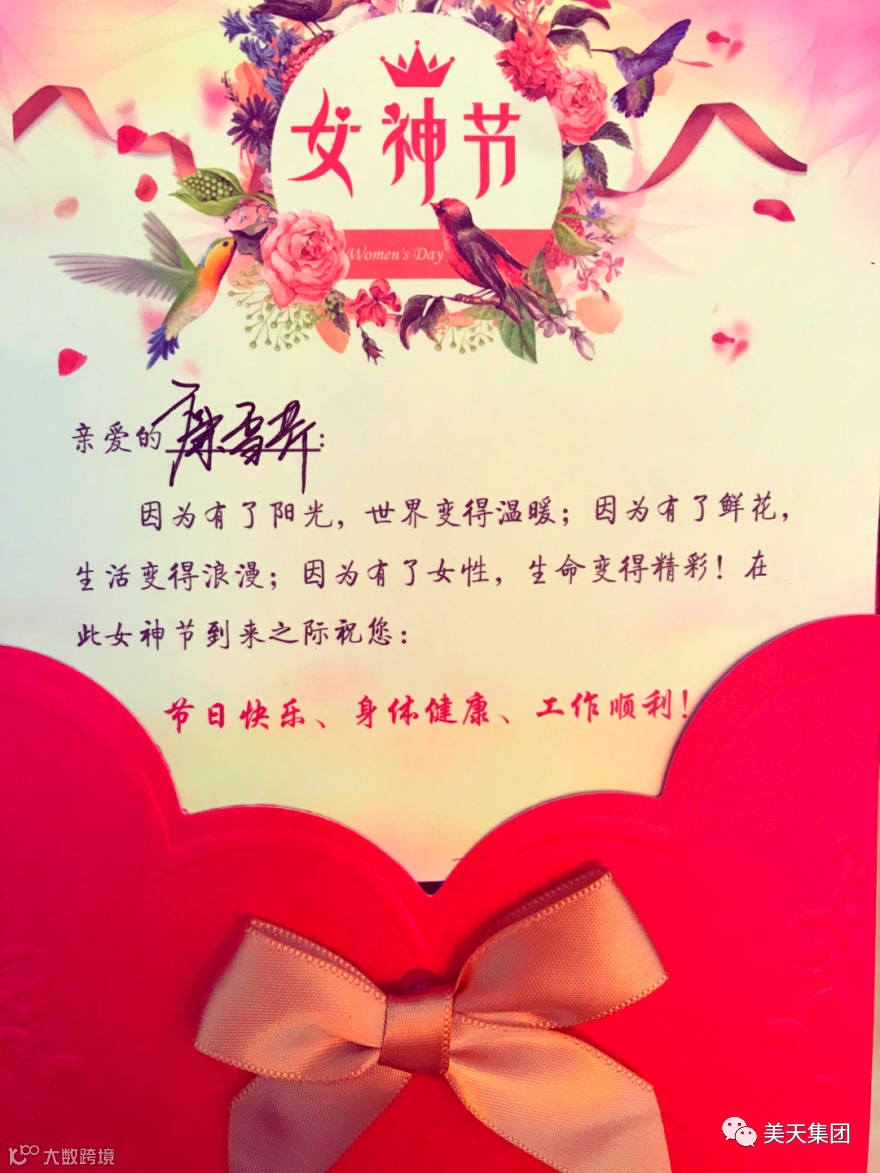 公司精心准备的礼品和卡片,让大家收获了喜悦与感动,大家纷纷表示:在今后的工作中将再接再厉,以更加饱满的精神和更加昂扬的状态投入到工作中去,积极发挥“半边天”的作用,全面展现巾帼风采,与美天一起共同进步、共同发展!