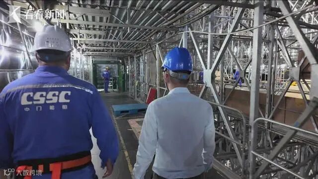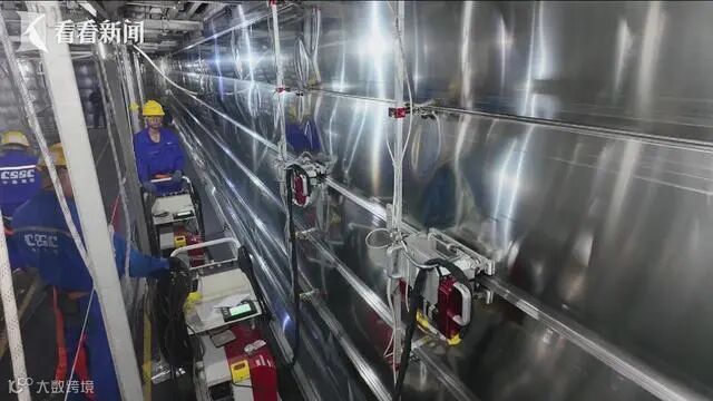 跟随建造人员,记者"钻进"这艘在建中的LNG船液货舱,近10层楼高、单体能装载超5万立方米液化天然气的液货舱,是建造LNG船的关键。