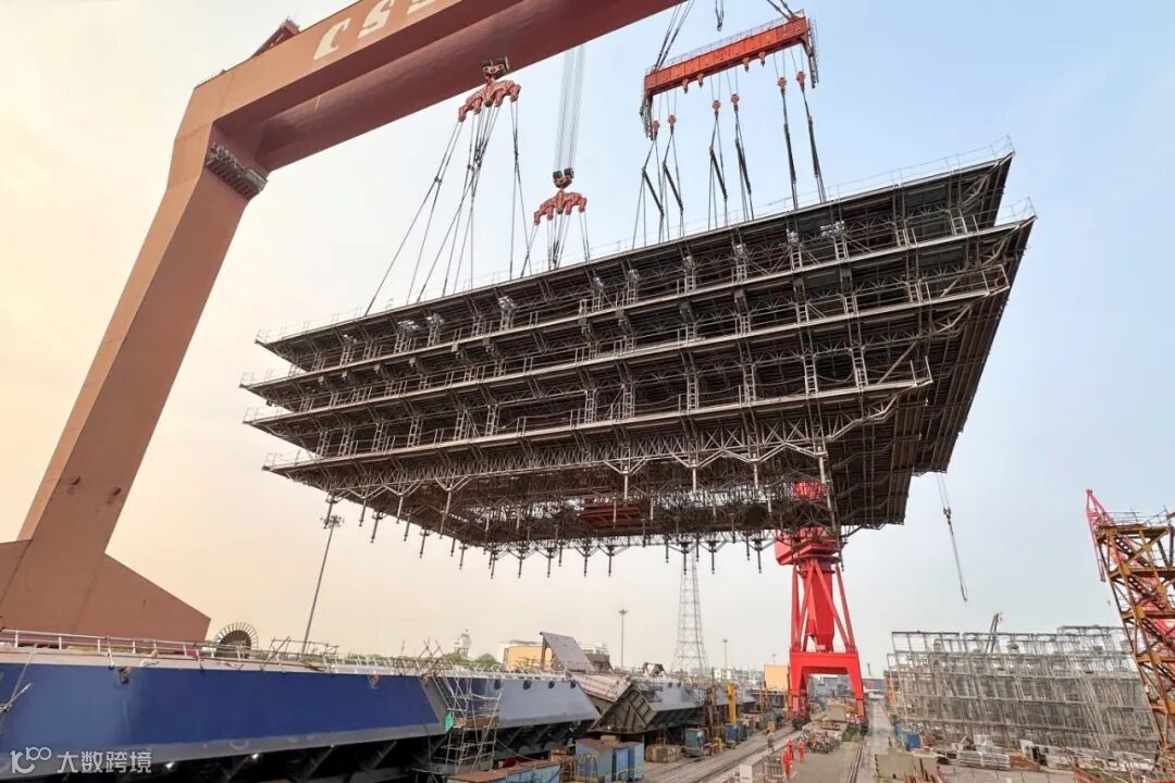 5月6日,法国达飞23000TEU双燃料集装箱船(H1904A)的MARK Ⅲ型围护系统安装平台仅用半天完成单舱整体吊装,创造国内围护系统安装平台的最大吊装吨位、尺度纪录。