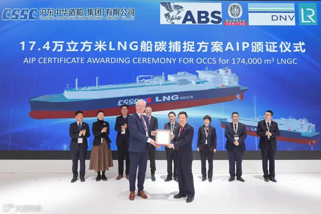 大会上,沪东中华推出了配装碳捕捉系统(OCCS)的17.4万方LNG船,为低碳航运发展贡献沪东中华方案。获得美国船级社(ABS)、英国船级社(LR)、挪威船级社(DNV)和法国船级社(BV)原则认可。该型船保持第五代LNG船快速性好、航行排放少,先进程度高、全球通用性强等一系列优点,同时设计安装了具有高吸收率、低能耗、空间紧凑等特点的国产碳捕集系统,满足2040年CII排放标准。该系统由711研究所开发,捕集效率最高可达90%以上,吸收的CO2纯度可达99%以上,可针对不同营运计划与CII排放要求提出个性化设计。